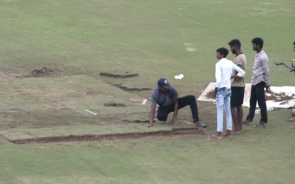 The groundstaff had cut a portion of the grass from the practice area and had brought that onto the wet section of the ground but the solution didn’t pay off. The super soppers were at work to make the outfield ready for the play since Day 1.
