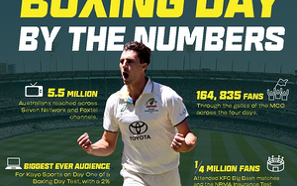 Kayo Sports recorded its highest ever audience for a Day One of a Boxing Day Test, which was up 2% year-on-year. In total across the four days, more than a quarter of a million people attended the Test and KFC Big Bash League matches.