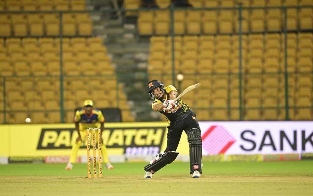 The Shivamogga Lions lost Nihal Ullal (0) as early as the second ball of the innings, in the same over Abhinav Manohar crafted three boundaries to switch the momentum back towards Shivamogga. Impact player, Rohit Kumar (12) also carved a six and a four in quick succession to bring Shivamogga to 29/1 by the end of the three-over powerplay.